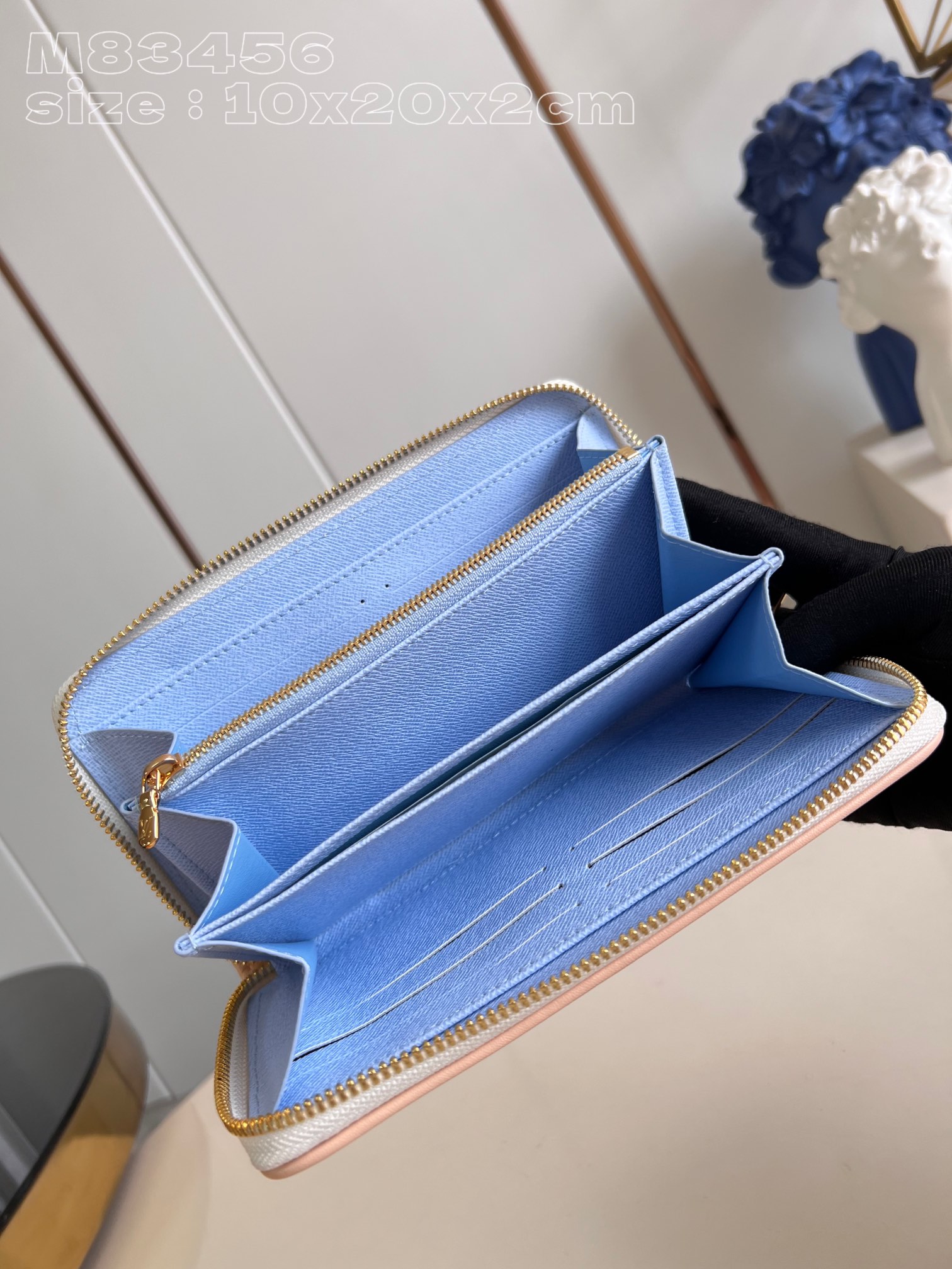 素材:モノグラム・パターンをジャカードで施した生地トリミング:レザー(皮革の種類:牛革)ライニング:レザー(皮革の種類:牛革)金具(色:ゴールド)ファスナー開閉式マチ付きコンパートメント x 3紙幣用ポケットファスナー式コインポケット内フラットポケット x 2カードスロット x 12